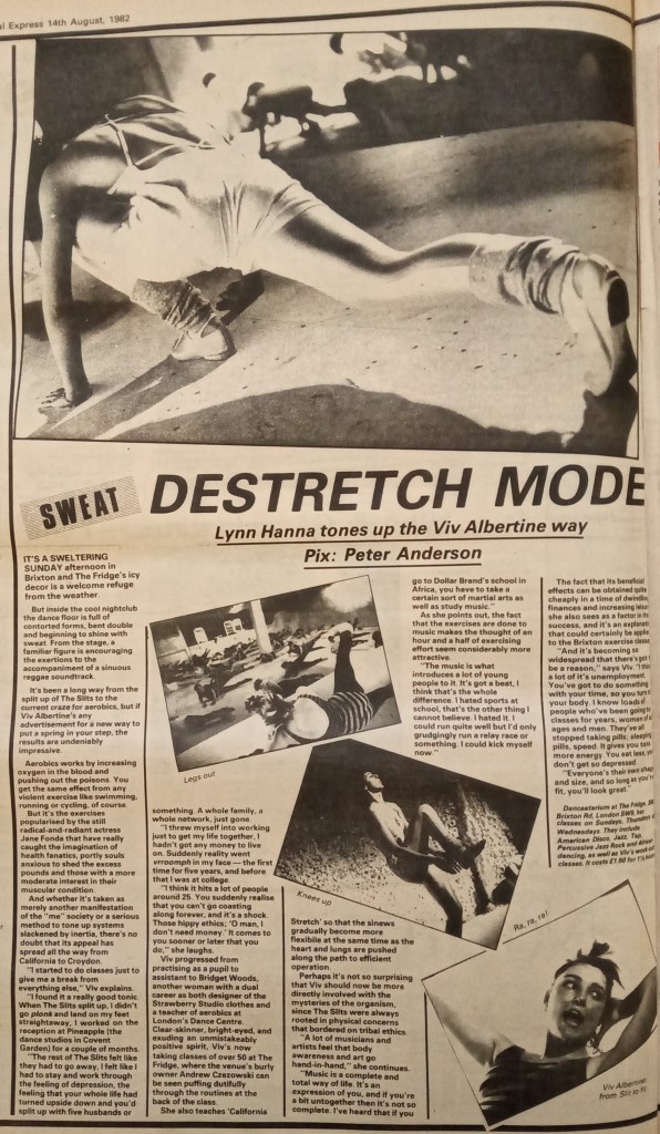 What we didn’t know was that Viv Albertine, guitarist with ground breaking punk band The Slits, used to teach aerobics at The Fridge in 1982. Still smarting from the break up of The Slits earlier in the year, Albertine threw herself into work. After a brief apprenticeship, she started aerobics class at the original location of The Fridge, 390 Brixton Road.