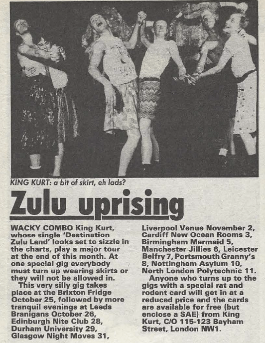 Not for the faint hearted, punters shouldn’t think about wearing their best party frock. King Kurt gigs got messy, very messy; as this clip filmed at The Fridge for the BBC’s Riverside show demonstrates: