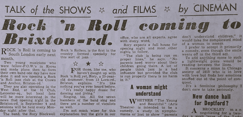 After the success of the opening night, promoter Ian Simm hoped to book Lambeth Town Hall. However, it was not to be. Teddy Boys were already the bete noire of the UK press but matters moved to a whole new level when just two weeks after the opening of the club at the Crown and Anchor, Billy Hailey and the Comets’ film “Rock around the clock” was shown across cinemas in South London. Following screenings in Elephant and Castle the South London Press headlines frothed “800 in rock ‘n’ roll riot”. The subsequent report revealed that the “riot” would be considered a minor disturbance by today’s standards. Nevertheless, the bad publicity scuppered plans to move the club to the Town Hall.