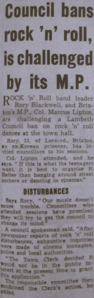 Local MP Marcus Lipton was in attendance at the first session and expressed his approval, so much so that he spoke out against Lambeth council, who very quickly moved to ban rock and roll events at the Town Hall.