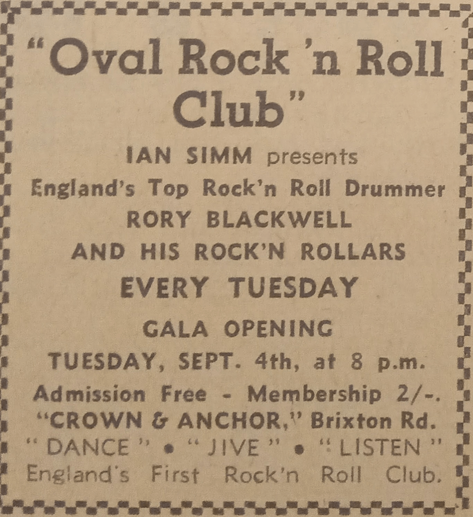 The title of Britain’s first Rock and Roll club could be hotly contested. Most people consider the 2I’s coffee bar in Soho to be the cradle of British Rock and Roll because of the plethora of talent that played there. Although the bar opened in April 56 its initial groups were skiffle groups, who didn’t start playing until July 1956. So it could be argued that the Oval Rock n’ Roll Club at the Crown and Anchor in Brixton Road was the first club to label itself as being specifically a Rock and Roll Club. Whoever was first, it is fair to say that the Oval club was certainly at the very least one of the first Rock and Roll Clubs, opening in September 1956, just weeks after the 2I’s put on their skiffle groups.
