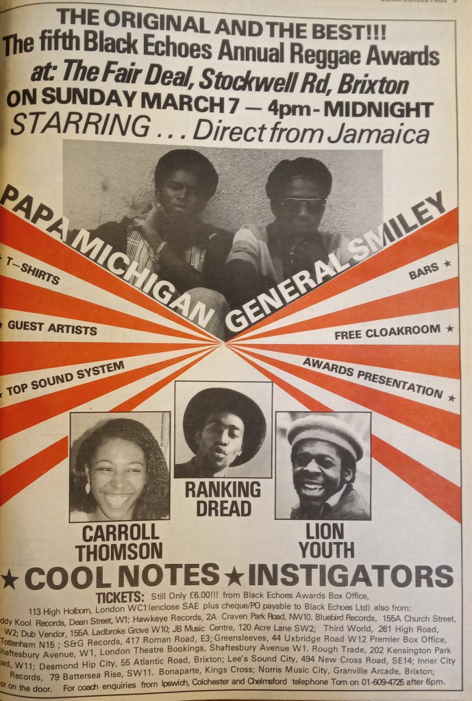 Prior to the official opening, Black Echoes magazine held their annual awards show on 7th March, due to feature Michigan and Smiley, Ranking Dread, Carol Thompson, Lion Youth, The Cool Notes and The Instigators.