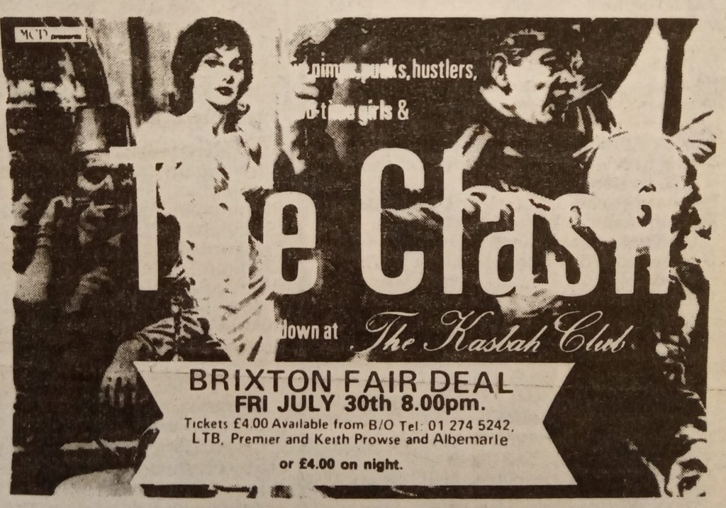 The Kasbah club was The Clash’s attempt to, in their words, “get away from the predictable rock industry format….The club will take over halls for the night as a celebration of low life and Clash fans (sic). As well as the Clash playing there will be guest appearances by celebrities, public figures and other attractions…..if England make it to the World Cup final, the match will be shown on a live screen in the foyer of the Casbah Club, Brixton Fair Deal on July 11.”