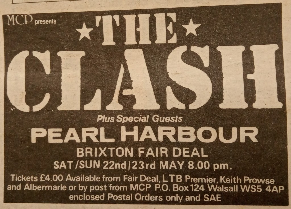 The Clash finally got to play their postponed dates on the 11th and 12th July. In true Fair Deal fashion it all seemed a bit chaotic. Time Out listed the gig with the caveat of “At the time of going to press The Clash Bill…was in such chaos that Sid, Doris and Aunt Madge Bonkers could well be playing. Aswad pulled out and The Burundi Drummers were/weren’t playing, leaving a gap between The Clash and guest Honey Bane….The only certainty is that the Rolling Stones are not playing. Waitaminute…”