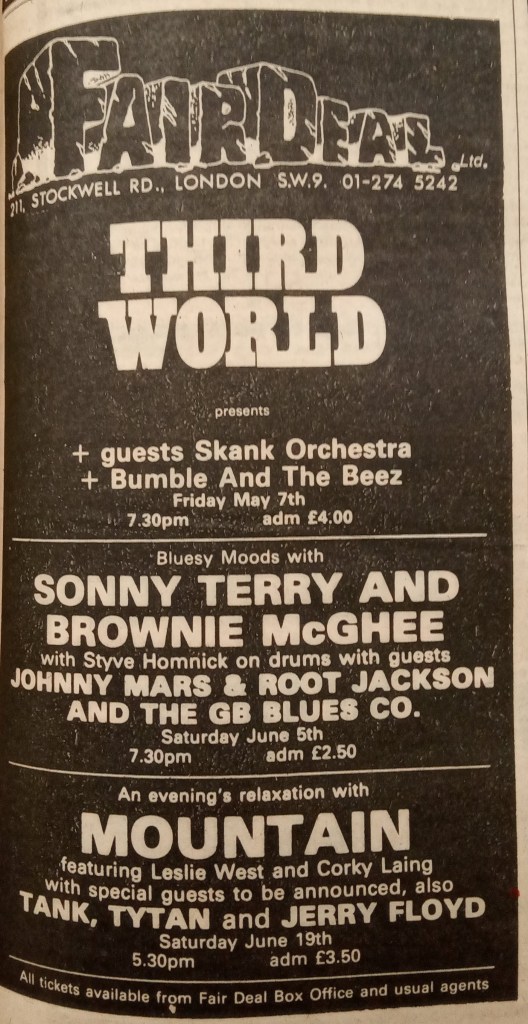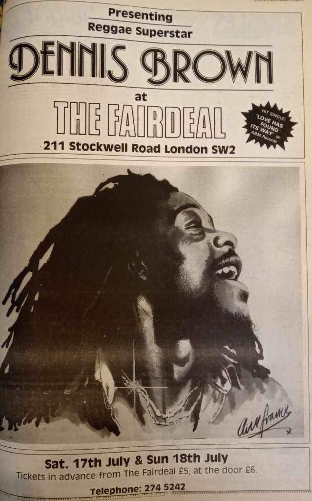 Dennis Brown was listed as playing the Fair Deal on the 17th and 18th July. The NME stated that the tickets were a “prohibitive £6 on the door”.