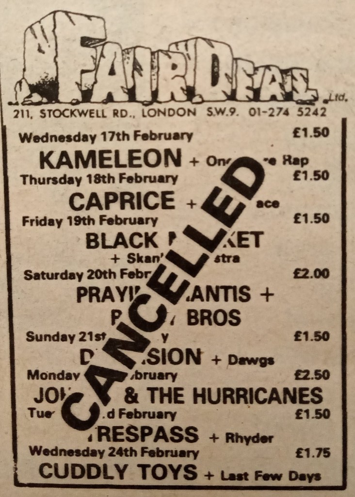 “Following the temporary collapse of the Fair Deal, helped on its way by a steady backlog of bills and bad debts piled up by Briggs Gigs Ltd, the Scots based company which kicked off the brave new South London rock enterprise in March this year, the chances of refunds for the 1,500 punters who bought tickets direct from the venue seem slim.