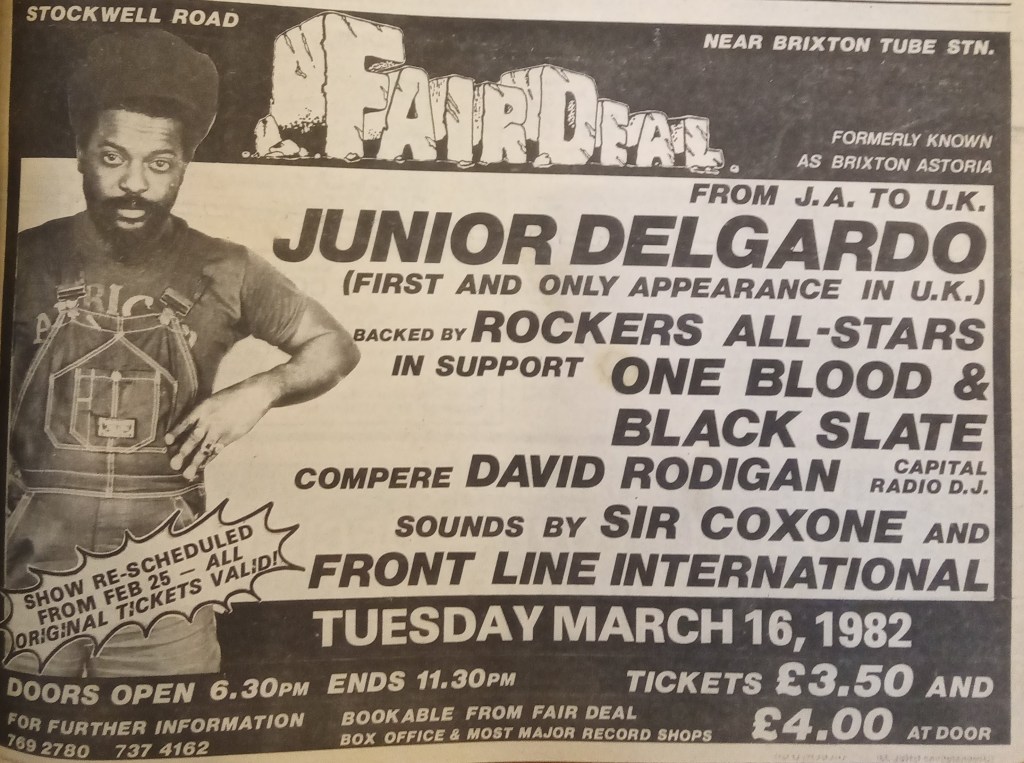 Sugar Minott rounded the night off. It wasn’t a good night for him. His cassette player was stolen backstage and during his set the crowds started to visibly thin out due to a combination of wanting to catch the last tube home, the arctic conditions in The Fair Deal and a dodgy PA. As someone pointed out “Most of the Brixton youths there, have better PA stacks in their bedrooms.”