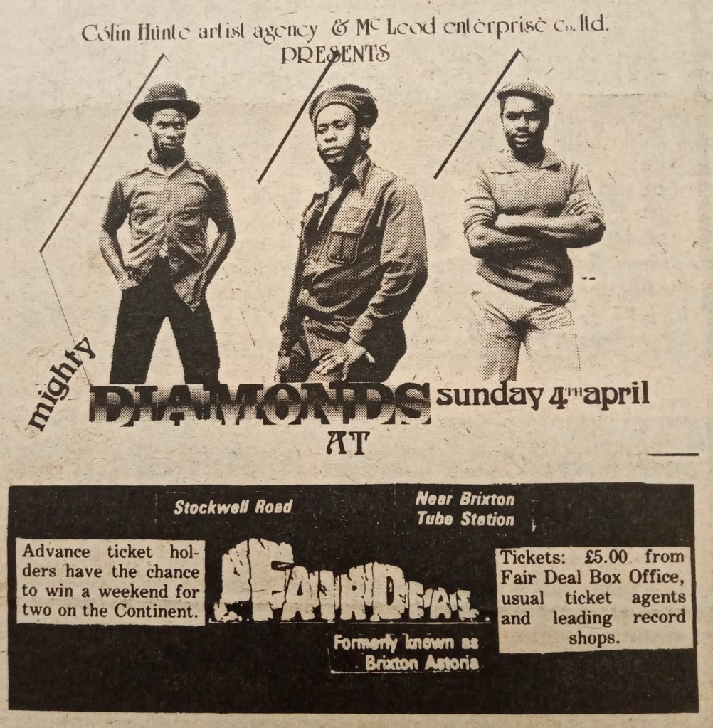 At the beginning of March it was announced that The Might Diamonds would be playing the Fair Deal on the 6th April to promote their single “Pass the Koutchie”, a version of which was taken to Nr 1 in the pop charts by Musical Youth just six months later. The gig was rescheduled for the 17th April. However, this was cancelled as well. According to the NME the group had flown to the USA after a dispute with their British promoter. Although the dispute was subsequently resolved, it was too late for the group to fly back.