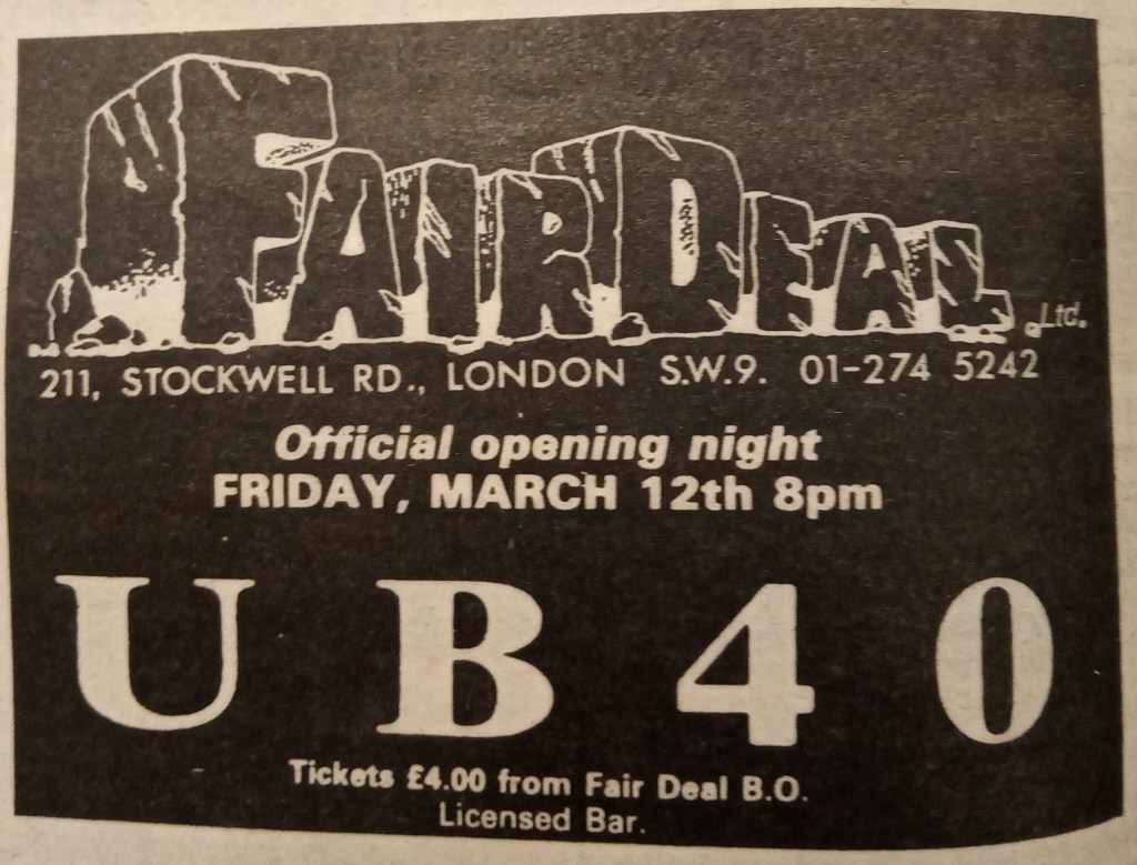 The writing was on the wall in late August when the NME announced that rumours were circulating that the Fair Deal was facing closure. “We have a hard fight on our hands”, admitted Alan Briggs, whilst at the same time announcing two gigs by UB40 in September.