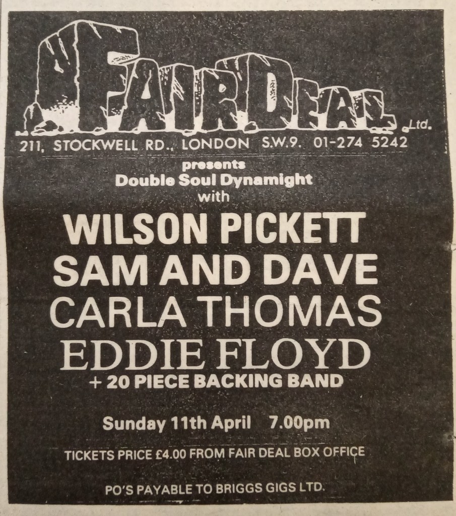 The “Double Soul Dynamight” package, featuring 60s soul stars, was due to play on the 11th April as an exclusive London date. The artists’ record companies had lined up Best Of compilations to be released to coincide with the date. Unfortunately, the headliner was Wilson Pickett, who the NME described as holding the record for blowing out more British concerts than any other American act. Regrettably, whilst the package was touring Europe, Wilson got drunk and ended up in a punch-up with two band members and a hotel official. The entire tour was consequently cancelled, leaving hundreds of disgruntled fans outside the Fair Deal, who had turned up unaware that the gig was not going ahead. The situation was diffused by giving them their money back, a free drink and a disco. The Fair Deal’s management were left to lick their wounds and try and recover their money.