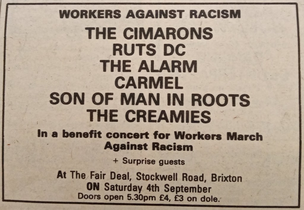 The 4th September saw a benefit gig for the Workers March against Racism, a four day march from Brick Lane to Brighton.