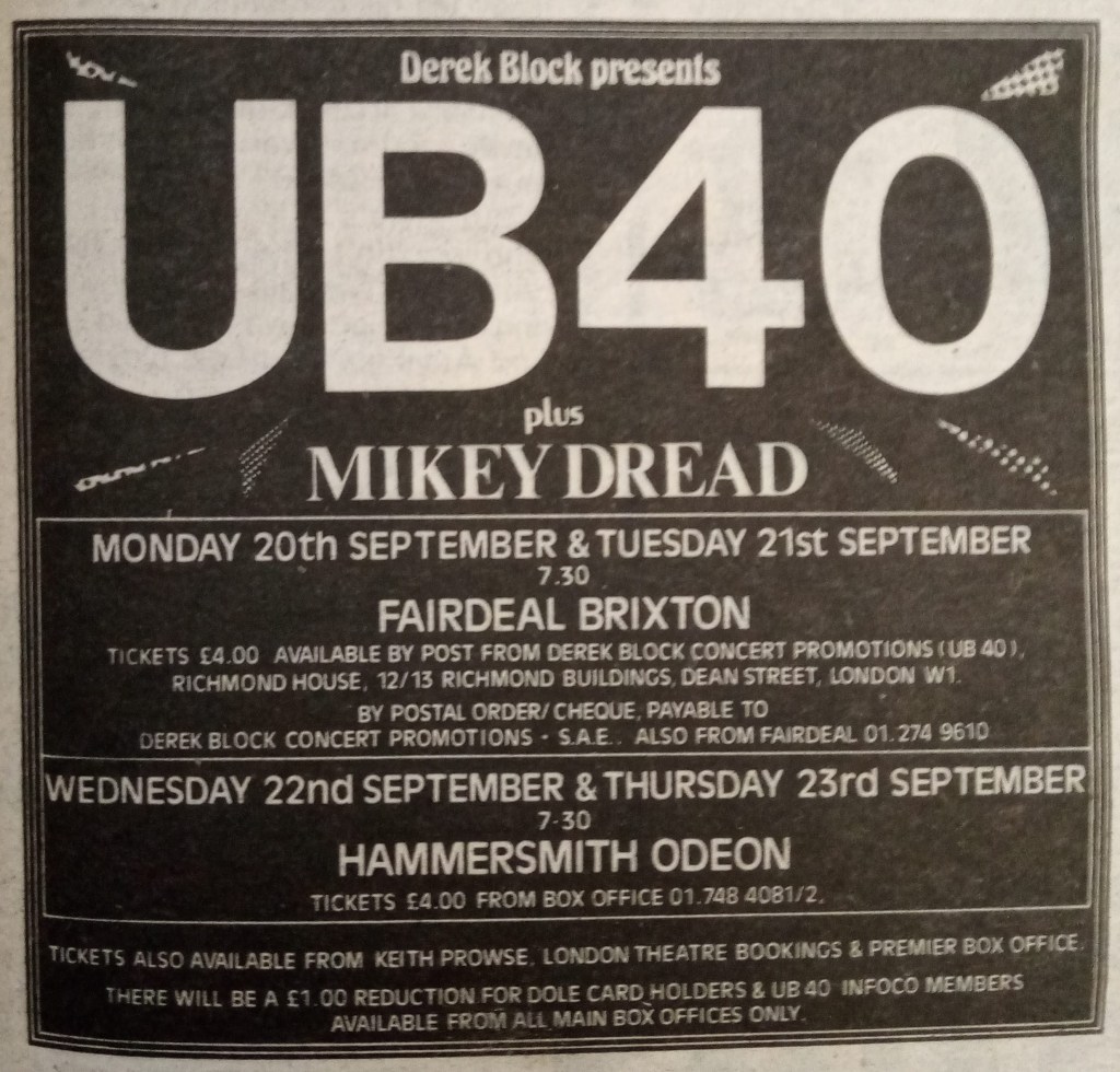 Sounds magazine used to run a weekly consumer advice column called (ironically) “Fair Deal”, which added some more detail as to what had happened with the Fair Deal. A reader had written in to say that he had bought tickets to the UB40 gig and asked if there was any way he could get his money back.