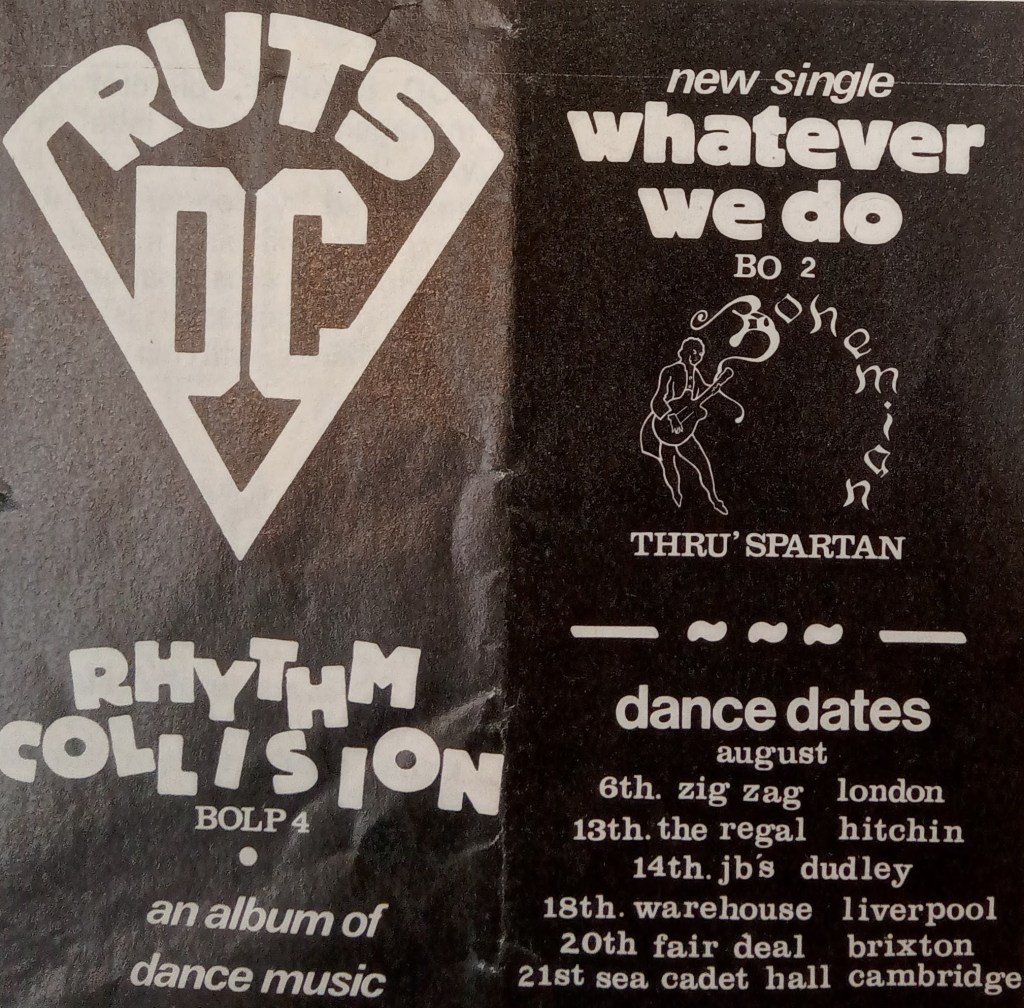August commenced with more foyer gigs, now renamed The Pub Club, from The Impossible Dreamers, Blue Midnight, Fan Club and Me, Dangerous Visions, Apocalypse, Achilles Heel and Zeitgeist. The gigs were no longer free but entry was only £1 plus 50p off the first drink. The Ruts DC also played the foyer on the 20th August.