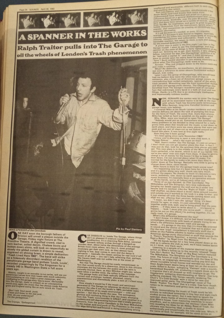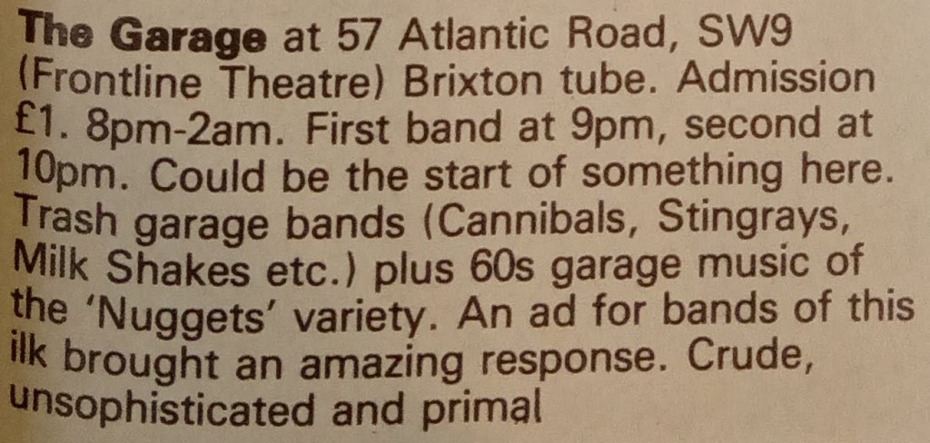 We have listed below the gigs advertised in the music press for the Garage Club in 1982 and 1983. The pool of talent for the genre seems to have been fairly small given the number of repeat performances.