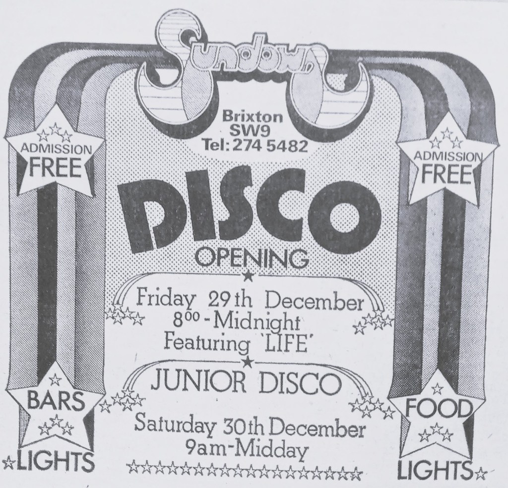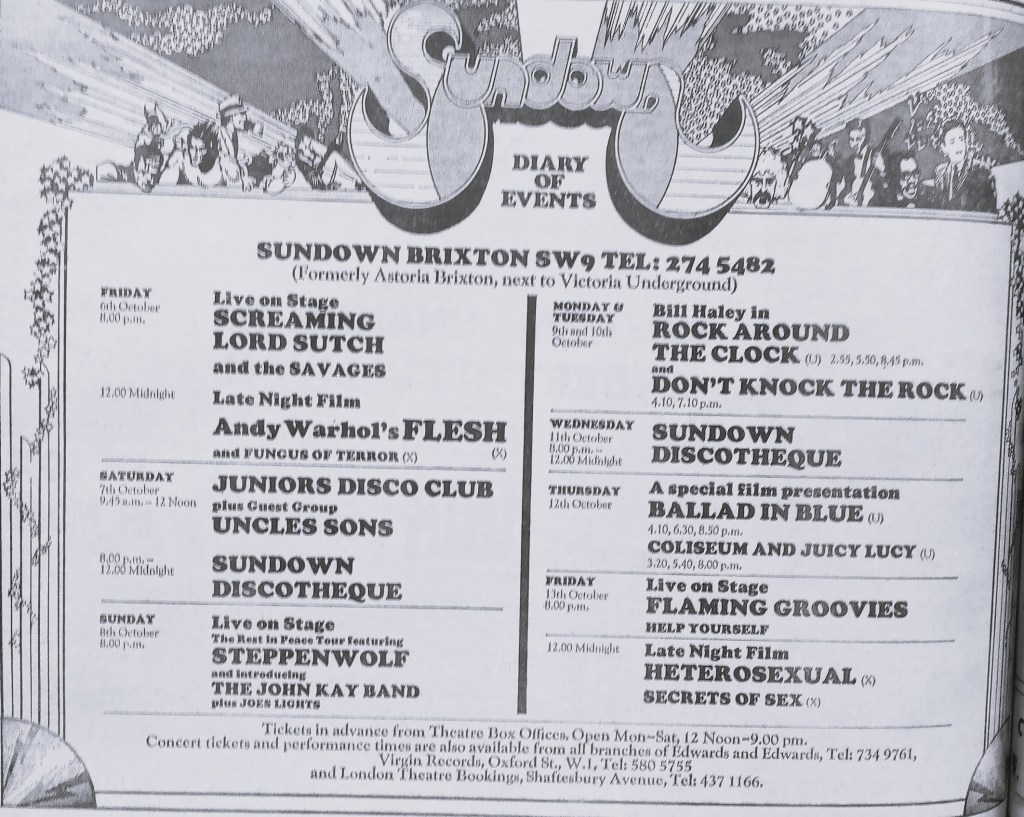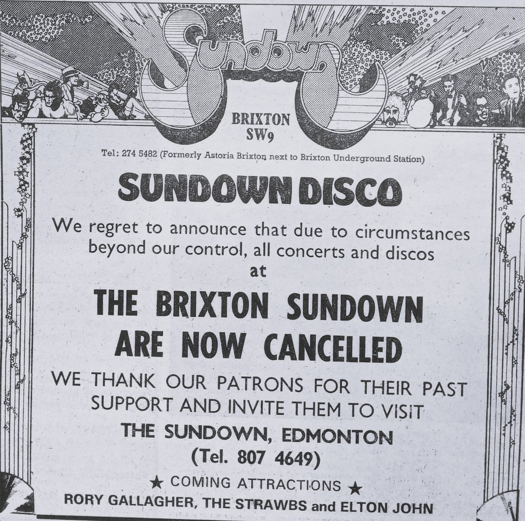 The four Sundown venues were all owned by the Rank cinema organisation and comprised venues in Charing Cross Road, Edmonton, Mile End and Brixton. The Brixton venue was on the site of the Astoria cinema, the venue we now know as the Brixton Academy.